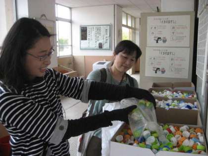 ペットボトルのキャップを集めると,カンポさんが引き取ってくださいます。
