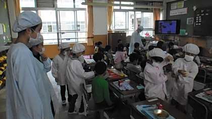 給食時間になると,6年生のお兄さんお姉さんがやさしく教えたり手伝ったりしてくれました。