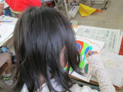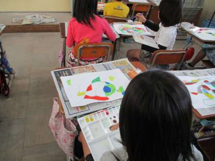 クレパスで好きな線の一筆書きをし,できた模様を見て,絵の具で色付けをしました。