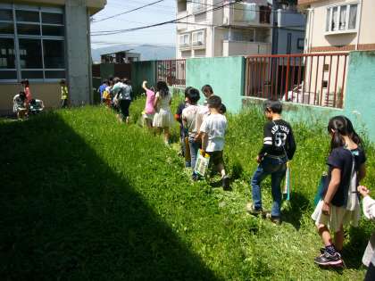 体育館の裏にはシロツメクサがたくさんはえていました。