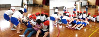 鬼に引っこ抜かれないようにチームで支えあう遊びです。