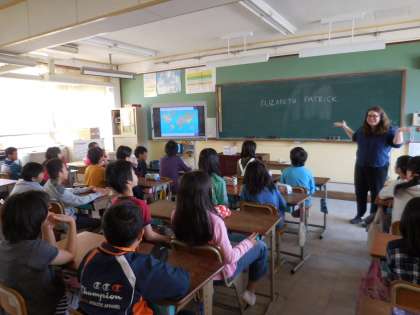 子どもたちは興味津々で,英語の音やジェスチャーで,何を伝えようとしているのかを予想しながら反応していました。
