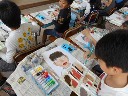 自分の顔をよく見て,触った感触を確かめながら描いた下書きに,絵の具で色を付けています。