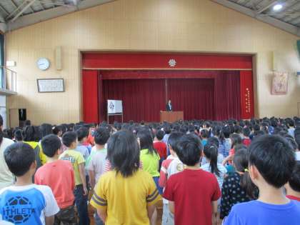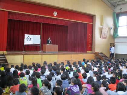 今年度はじめて,全学年が集まり朝会がありました。