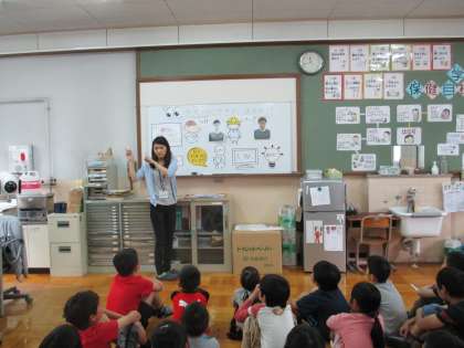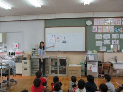 はじめに養護教諭より,赤ちゃんのときに見えている様子と今の様子の違いについてお話がありました。