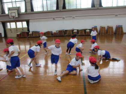 国語で学習した「ふきのとう」の登場人物になりきってみたり、様々な動物になって歩いてみたり。最後はみんなで進化じゃんけんをしました。