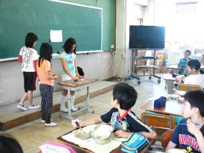 給食を少し早く食べ終えてみんなの雨でマジックをしています。