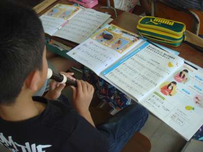 リコーダーで,上の「ファ」と「ソ」の練習をしています。サミングにも慣れてきました。