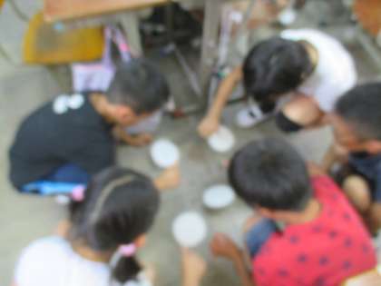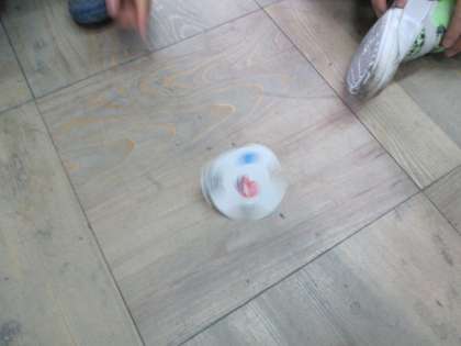 算数科では,円と球の学習をしています。本時では,いろいろな形のこまをつくり,3つの点をかきました。「まわすとどんな形になるのか」「まわすと,3つの点はどのような形になるのか」を調べました。こまをまわすと,「形ももようもまるい形になる」という新たな発見に驚いていました。