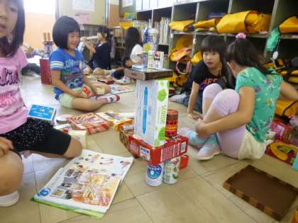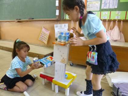 6月2日(木)の5時間目,算数の時間にいろいろな形の箱をつかってかたちづくりの学習をしました。箱をつんだりならべたり,友だちといっしょに楽しみながら活動しました。はこのかたちをいかした,きりんや車,ロボットなどが出来上がりました。