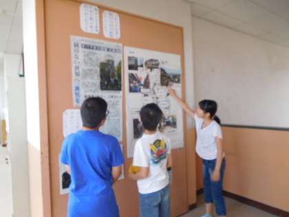 修学旅行で行く広島の様子やこんぴらさん,ホテルの様子などを廊下に掲示しています。