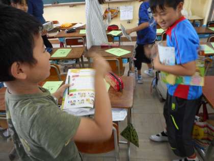 みんな最初は「何を言っているの?」と不思議そうにしていましたが,パトリック・エリザベス先生の表現をみて「あ,そうか!」と数を数える学習だと理解することができました。