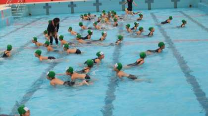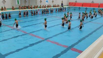 大きなプールで歩いたり走ったり,わにさんになったりして水遊びを楽しみました。