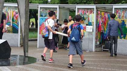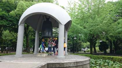 みんなの声,願いが平和記念公園に響き渡りました。折鶴をささげ,平和宣言をしました。平和共存の世界を達成することを目指し,その文化運動のシンボルとしてつくられた「平和の鐘」をグループで1回ずつつきました。