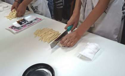 生地を薄く延ばして,切っていきます。同じ太さになるよう慎重に切っていきました。そして「マイうどん」の袋に詰めてこれで出来上がりです。