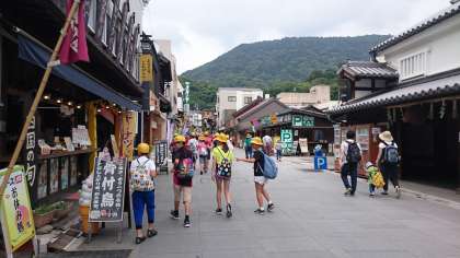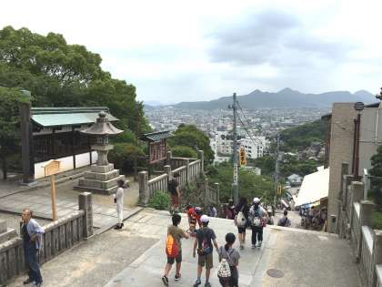 石畳のところから336段登って,もう大門まで到着した班があります。大門のところから,琴平の町並みを眺めて,思わず「きれ〜い!」と言う声が聞こえてきました。子ども達の心にも残る風景です。
