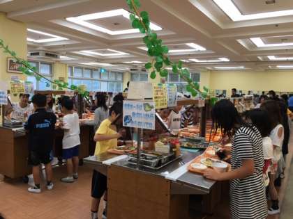 待ちに待った晩御飯です。焼きそばや海鮮の炒め物など。バイキング形式で,好きなものを取っていますが,もちろん,好きなものだけ取って食べるのでなく,いろいろ考えてお皿にとっています。