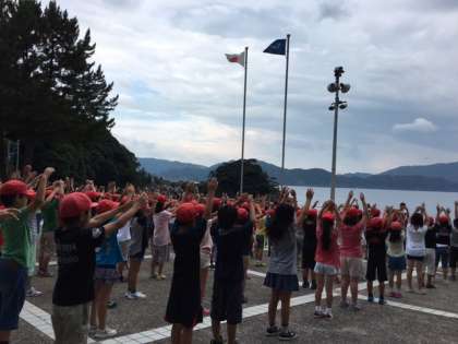 曇り空ですが,子ども達は元気いっぱいです。今日のラジオ体操は,なんと英語版でした。3日目のメインは,若狭塗り箸づくりの活動です。