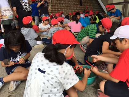 お箸の中のお宝を探すようにやすりで削っていきます。班で一つの洗面器を囲んで楽しく作業しています。