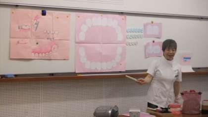 きょうは歯科衛生士の先生に学校にきていただき,歯のお話を聞いたり正しいはみがきの仕方を教えていただいたりしました。