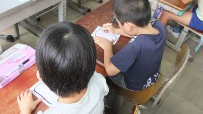 そのあと一年生のみんなにもその「まほうのたべかた」の紙をくばってもらいました。みんな丁寧に名前を書き,嬉しそうに中を見ていました。
