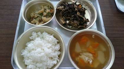 献立の内容は,ご飯,伏見とうがらしとじゃこのたいたん・牛肉とひじきの炒め煮・とうがんのくずひきでした。