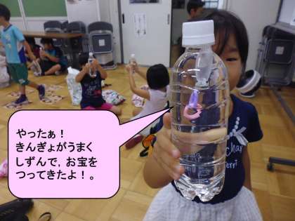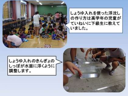 1回目は「楽しい科学教室」で,浮沈しをつかってきんぎょの浮き沈みを楽しみました。うまく底に沈んでいるお宝をつって上がってくることができたら成功です。1・2年生の子どもたちには少しむずかしかったようですが,高学年の児童がていねいに教えてくれていました。振り返りの感想には,「うまくできてうれしかった」という内容と,「高学年の人に教えてもらってうまくできました」という内容がありました。
