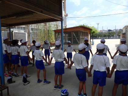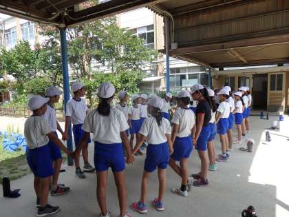 練習後には,いつもチームとして手をつないでひとつになり,その日の感想や思い,これからに生かしていきたいこと等を一人一言ずつ伝えます。子どもたちは,自然と誰かが言ったことに対して反応を返すようになっています。先生がそうしなさいと言ったのではなく,子どもたちが自発的に始めたことです。相手意識をもって,友達の考えや思いを聞こうとできる素晴らしいチームになってきています。