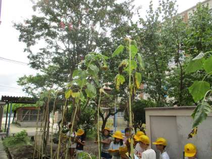 夏休みが明けて大きく育ったひまわりに子どもたちはびっくりしていました。