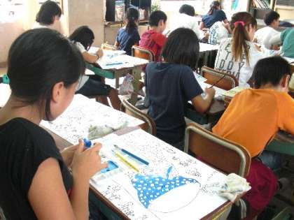図工「お話の絵」の着色をしています。