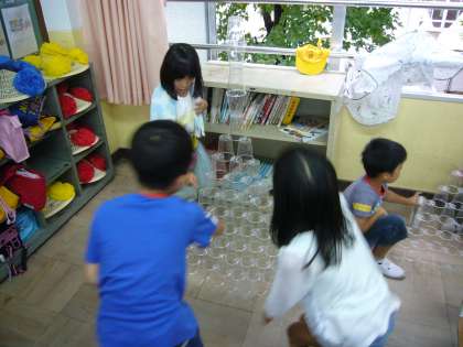 生活科でプラスチックのコップを積んで遊びました。