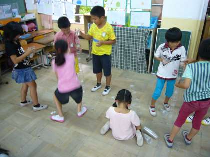 積み方を工夫して、何段積めるかグループに分かれて
