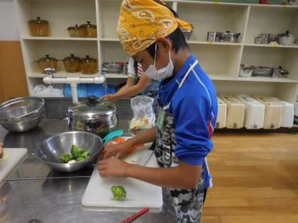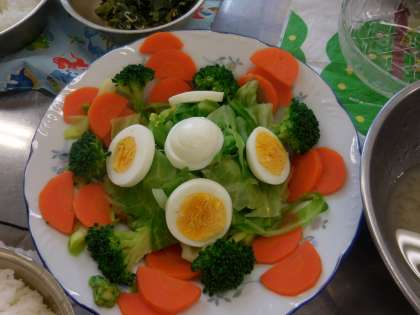 メニューは『ゆで野菜のサラダ』です。班で協力して時間内に準備・調理・食事・片づけまでしっかりとできました。