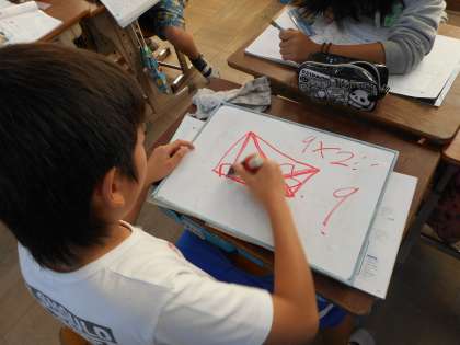四角形の面積を,三角形の面積の公式を使って導き出す学習をしました。