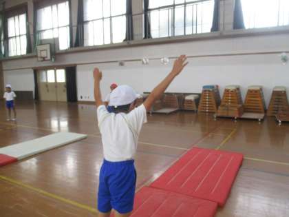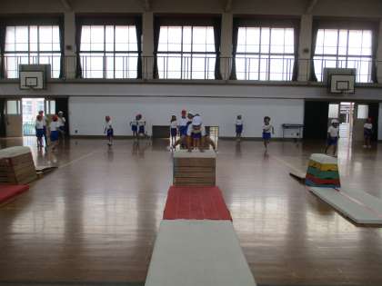 初回は,準備や片づけの仕方を確認したり,簡単な開脚跳びや閉脚跳びをしました。