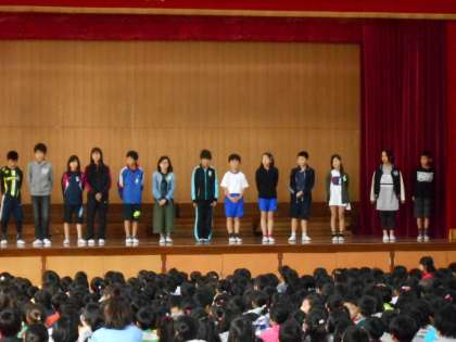 まず,音楽委員による今月の歌「はじめの一歩」を歌いました。