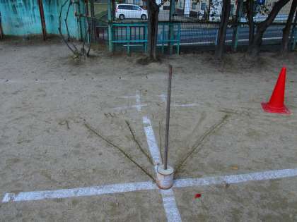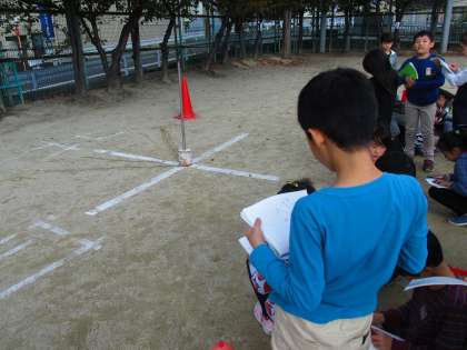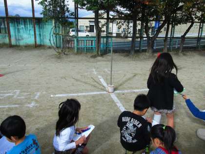 9時・11時・12時・2時、それぞれの時間のかげの方向から、太陽の場所を確かめました。