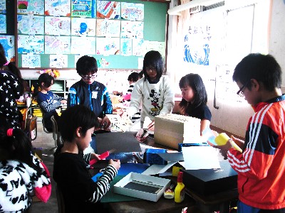 図工では,身近にある箱や包装紙などからオリジナルの箱を作ります。