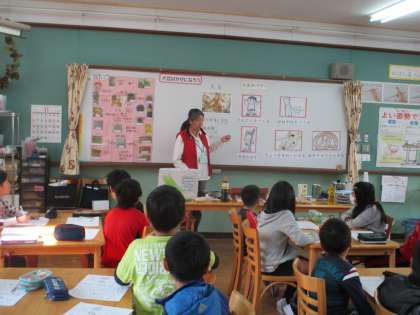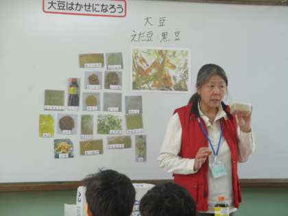 栄養教諭の八田先生による食の指導では,大豆のひみつについて学習しました。どの子も大豆がどんなすがたに変わっているのか真剣に考えていました。