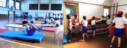 後転の練習に,跳び箱で使う踏切版を入れました。
