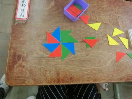 今日の学習では,三角形の色板を使って,家や魚の形を作りました。