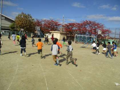 はじめに,全校ダンスで体をほぐしてから,曲にのって走りました。