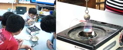 ガスコンロで金属の玉をあたためて輪をくぐるか実験した結果,体積が大きくなった金属は,輪を通り抜けませんでした。
