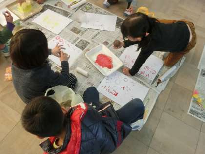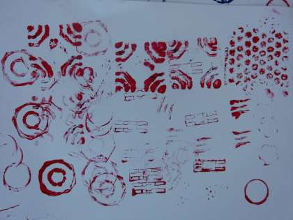 洗濯バサミやカップなど色々な物の形を絵の具を使って写しました。