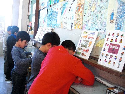 工夫いっぱいの説明文を書くために,本を開いて探す子どもたち。学