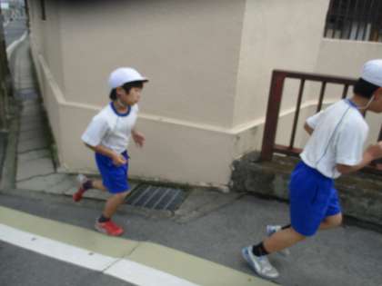 運動場と校舎の外周を2周します。2キロメートルのコースですが,みんな腕をふって,一生懸命に走っていました。