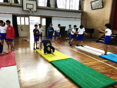 体育のマット運動では,学習の最後にこれまで練習してきた技を組み合わせて発表会を行いました。