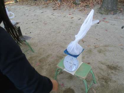 1kgだと思う重さの砂を袋に入れ,はかりで確かめました。