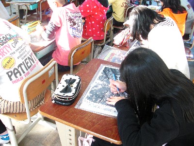 図工の版画の下絵をカーボン紙で写しとっています。