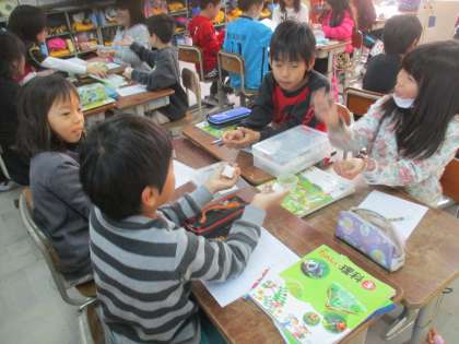 はかりを使って,鉄,木,アルミニウム,プラスチックの重さを比べました。